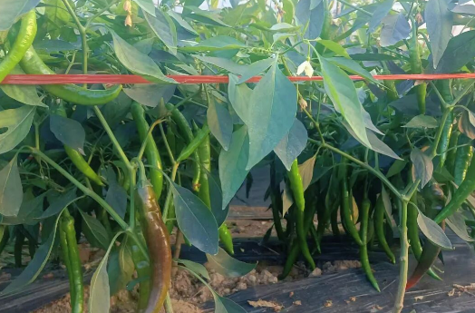 走进甜蜜农业辣椒基地,大棚内绿意盎然,株株辣椒长势旺盛,甸甸地坠在枝头,随手一摘便是满满的收获。农户们穿梭在辣椒地里忙着采摘、搬运,呈现出一派繁忙景象。
