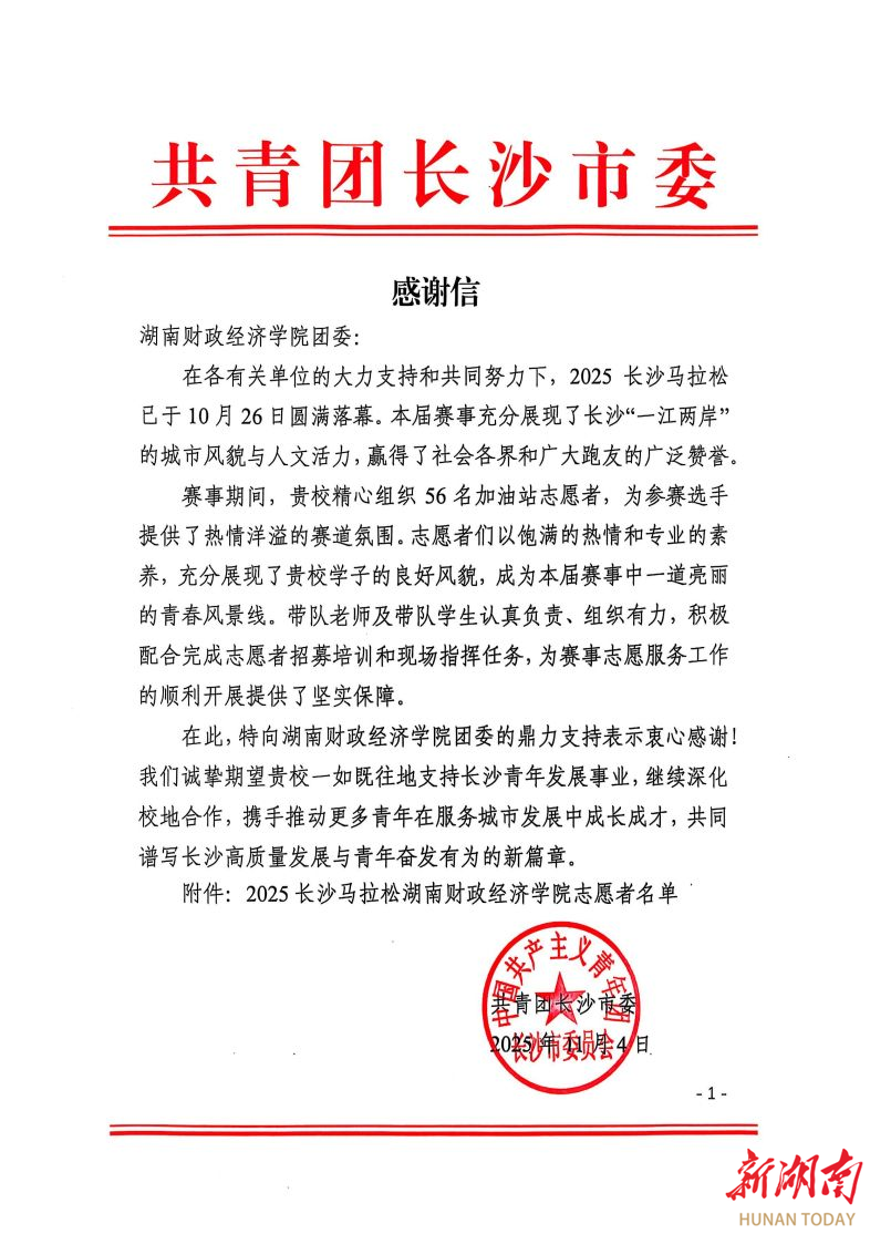 近日,湖南财政经济学院团委收到共青团长沙市委员会发来的感谢信,信中对学校在2025长沙马拉松赛事中的志愿服务工作给予高度肯定,并向全体参与服务的师生表示衷心感谢。
