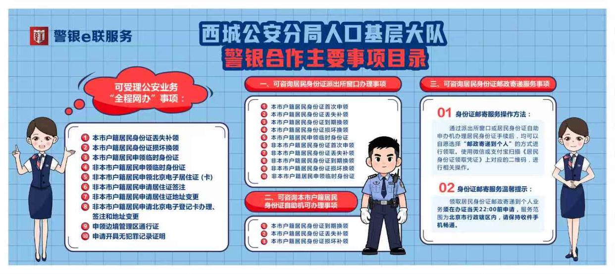 西城公安分局人口管理和基层工作大队相关负责人介绍,近年来,北京警方大力推动户政服务事项“无接触受理、不见面审批、零跑动办事”全程网办等便民举措。如本市户籍居民身份证丢失补领、损坏换领;申请领取临时身份证;非本市户籍居民电子居住证申领、签注、地址变更;开具无犯罪记录证明等多项业务都可以在符合条件的情况下全程网办。此次西城警方联合交通银行北京市分行创新打造“警银e联服务区”,进一步将便民利民举措延伸至群众身边。