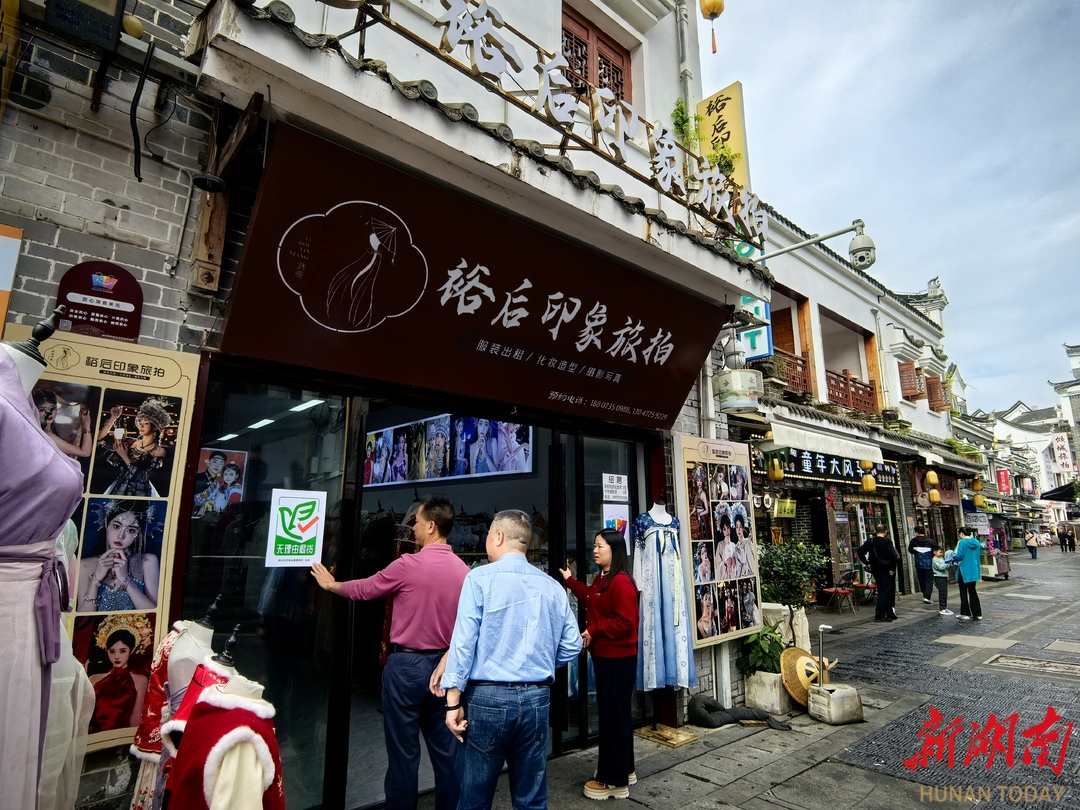 华灯初上,作为湘粤古道始发地、国家级旅游休闲街区的郴州裕后街,游人如织,市井烟火中藏着别样安心——门店上都悬挂着放心消费单元承诺牌,牌角的二维码像枚小巧的“诚信密码”,在灯光下格外醒目。