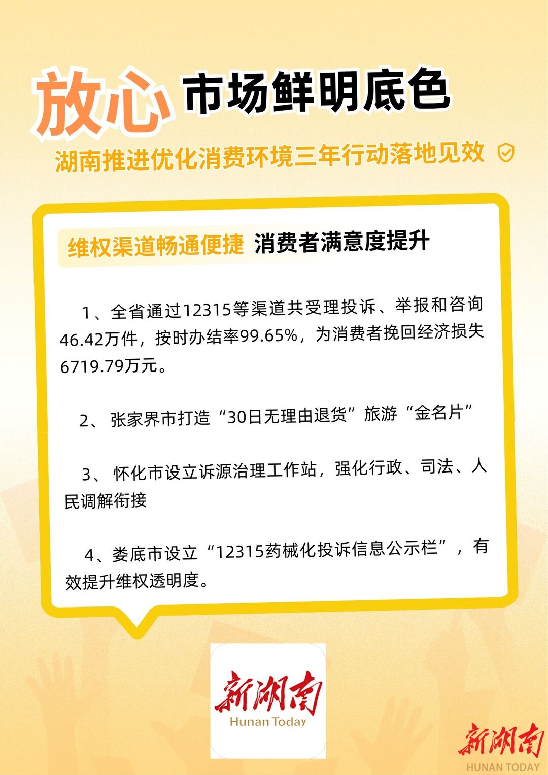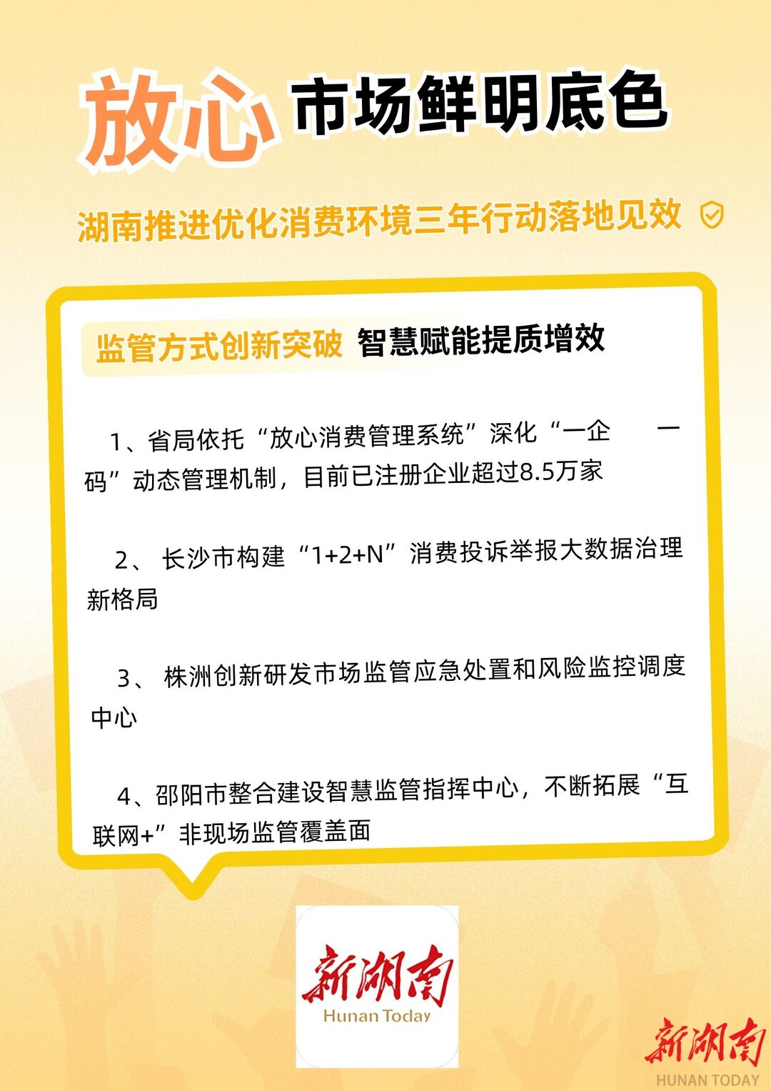 全省坚持省级统筹与基层创新联动,治理效能持续升级——省市场监督管理局依托“放心消费管理系统”深化“一企一码”,8.5万余家企业实现精准培育与全程智慧监管;邵阳搭建智慧监管指挥中心,不断扩大“互联网+”非现场监管覆盖面;张家界率先在全国同类旅游城市推行全域“30日无理由退货”,今年已办理退货4024件,涉及金额1500余万元。
