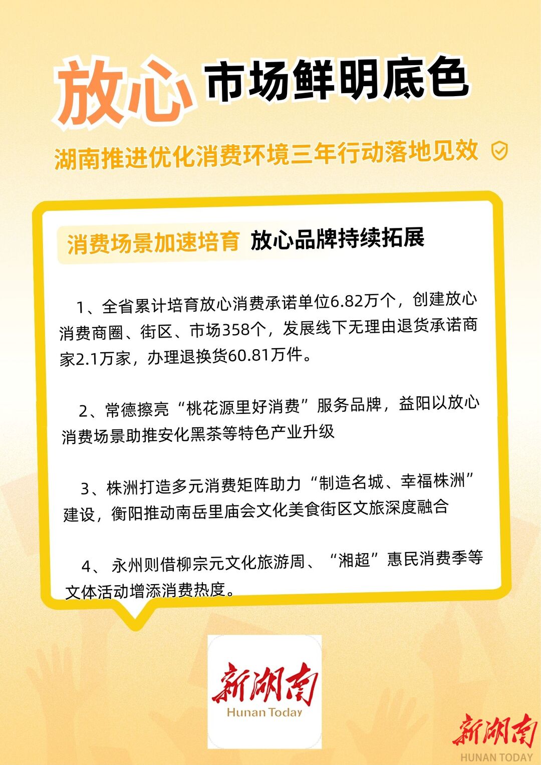 据悉,省市场监督管理局以“放心消费·幸福湖南”品牌为引领,全力打造多元消费场景、提升消费环境软实力。目前,全省已培育放心消费承诺单位6.82万个,创建放心消费商圈、街区、市场358个,发展线下无理由退货承诺商家2.1万家,累计办理退换货60.81万件。