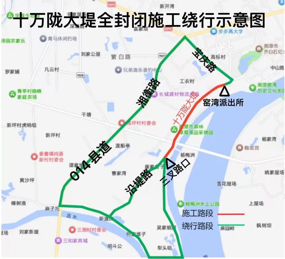 因湘潭市雨湖区沿江南路至杨梅洲大桥堤坝路提质改造工程建设的需要,建设单位湘潭市雨湖城乡建设开发投资有限公司申请对雨湖区十万陇大堤部分路段全封闭占道施工。根据《中华人民共和国道路交通安全法》和《中华人民共和国道路交通安全法实施条例》的有关规定,湘潭市公安局交通警察支队决定于2025年11月12日至2026年1月12日对上述路段实施交通管制,管制期间除施工车辆和人员外,禁止其他一切车辆和行人通行。