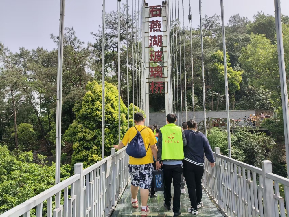 在“勇攀玻璃桥”环节,参与者们无畏玻璃桥下的万丈深渊,相互扶持踏上石燕湖玻璃桥,用勇敢和坚持诠释生命力量,以协作共赴无畏征途。志愿者们穿梭其中,随时为大家提供支持与帮助,确保每个人都能尽情享受这段时光。