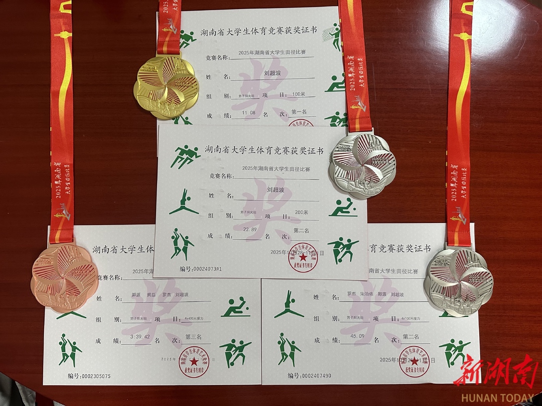 最终,他们以超快速度、默契配合,摘得2025年湖南省大学生田径比赛男子阳光组4*100m银牌、4*400m铜牌。