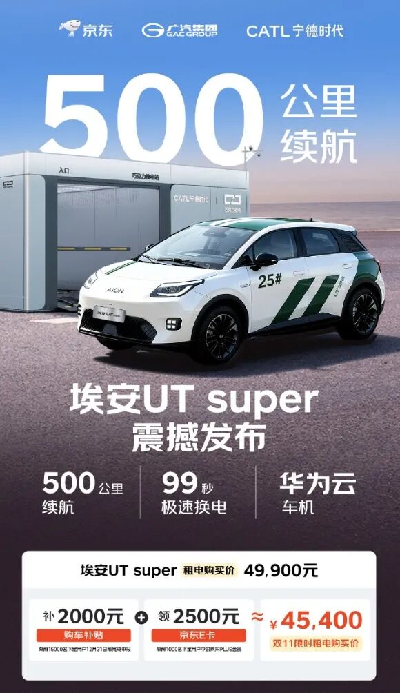 据埃安AION官微消息,由京东、广汽、宁德时代联合推出的埃安UT super正式官宣价格,电池租用价4.99万元,叠加汽车补贴及京东E卡补贴PLUS会员最低可至4.54万元。