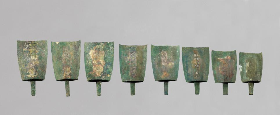 △青铜句鑃,收藏于广州南越王博物院。据院副研究馆员黄巧好介绍,这套青铜句鑃有四个典型特点:①出土句鑃中体形最大;②南越国自铸;③宫廷中实用乐器;④目前所见唯一的西汉时期青铜句鑃。
