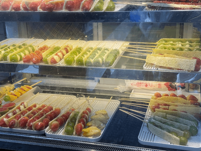 南门口的奶皮子糖葫芦店 侃财君摄现在的糖葫芦在水果部分,看齐了高端水果。榴莲、蓝莓、山竹已然变成“基本操作”,甚至把水果部分替换成鸭脖、玉米、甲鱼、秋刀鱼。但这样的糖葫芦只能说是引流吸客,特供消费者猎奇品尝。