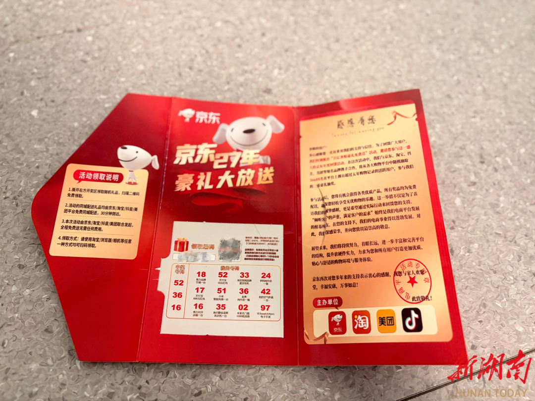邹小姐称,这张从浙江省嘉兴市寄出的“京东礼品卡”,有详细的寄件人信息,“京东27年、豪礼大放送”几个字很是醒目。卡片里面还附上一封感谢信,上面写着,为回馈广大用户,与京东、淘宝、抖音、美团等品牌携手合作,选取36688名活跃用户,参与三重豪礼抽奖,还强调“所有奖品均为免费配送”。