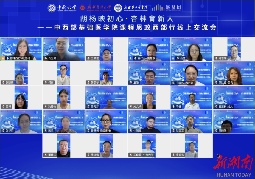 8月20日,“胡杨映初心・杏林育新人——中西部基础医学院课程思政西部行交流会”在线上开启,中南大学、新疆医科大学、新疆第二医学院等6所高校的 300 余名教师“云端相聚”。新疆医科大学的6位教师分享的真实案例,让不少人红了眼眶:有人坚守科研一线,探索噬菌体疗法为患者带来希望;有人扎根天山牧区,用脚步丈量每一片草原,守护牧民健康;有人执着于渐冻症研究,在医学难题前永不言弃……这些故事,生动诠释了医学教育与西部精神、家国情怀的深度融合。