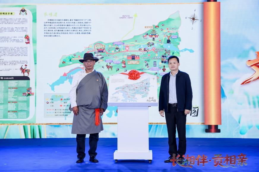 在招商引资和文旅合作推介环节,代表团立足贡嘎“西藏门户、雅江核心”的战略定位,从通达四方的枢纽之城、千年雅砻的传承之地、圣洁山河的画卷之境、净土珍品的荟萃之域和高原经济的崛起之窗五大维度对贡嘎县进行了全方位推介。活动现场,贡嘎县文旅手绘地图、2025年度文旅歌曲相继发布,直观展现县域文旅资源与文化魅力。还对西藏空港新区投资环境、临空经济合作机遇进行了重点推介。