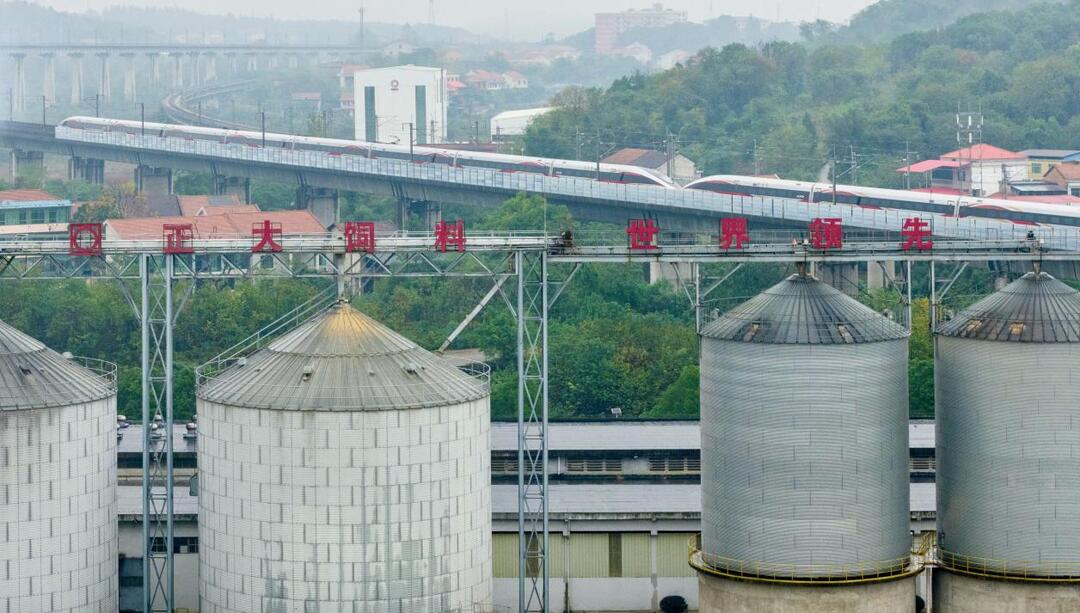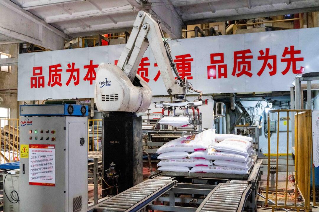 深秋时节,湘南腹地。正大饲料(衡阳)有限公司车间内机声隆隆,生产线高速运转,一袋袋封装好的饲料通过传送带送往流水线下游,全自动码垛机器人挥动长臂,将产品整齐码放。