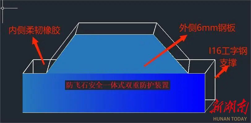 针对痛点,项目团队革新设计了一款“防飞石安全一体式双重防护装置”——通过“硬防护+软缓冲”的双重结构,配合可重复使用特性,成为隧道爆破区的“安全卫士”。