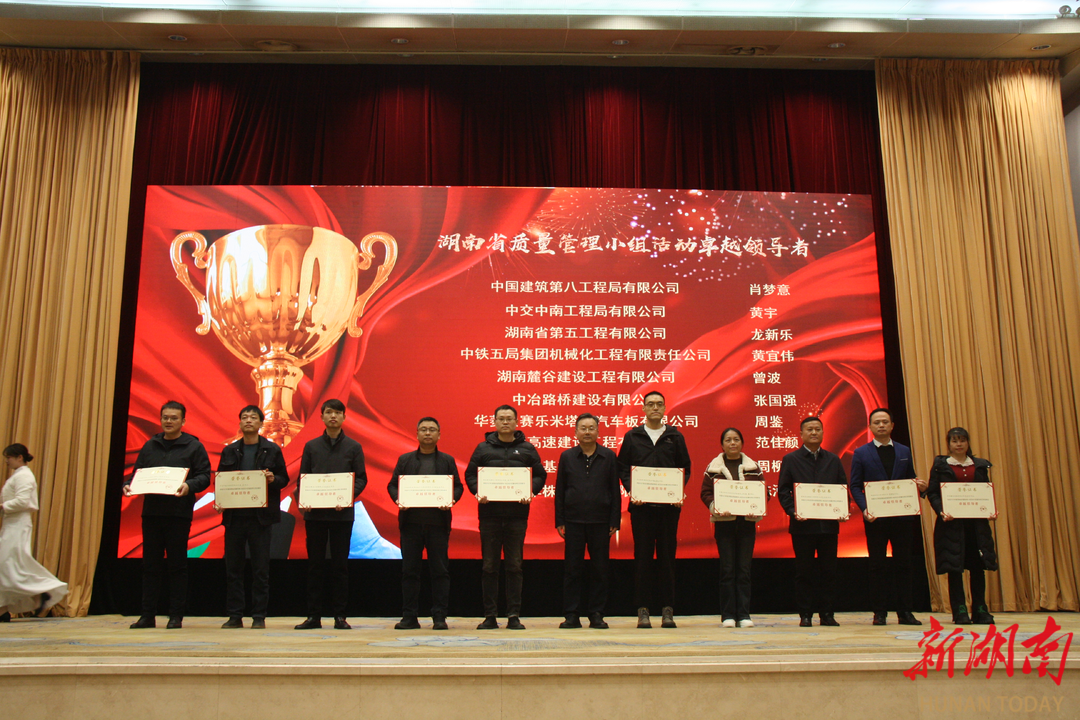 表彰环节成为大会亮点。本次大会共对九批先进典型进行表彰,包括质量管理小组活动一等成果代表、质量信得过班组建设一等成果代表,以及优秀企业、卓越领导者、优秀推进者、优秀小组长(班组长)等。其中,中国航发南方工业有限公司、湖南高速建设工程有限公司等 10 家企业获评 “优秀企业”;肖梦意、黄宇等 20 名同志获评 “卓越领导者”;李祚全、王娜等20名同志获评“优秀推进者”。同时,中建五局第三建设有限公司常德芙蓉公园建设项目等获评三星级用户满意工程,中国建筑第五工程局有限公司长沙轨道交通一号线北延一期工程等获评五星级现场。省、市相关部门领导分别为获奖代表颁奖。