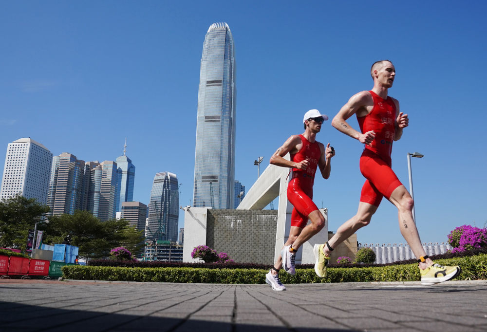 ↑11月15日,香港队选手奥斯卡(右)在铁人三项男子个人比赛中。