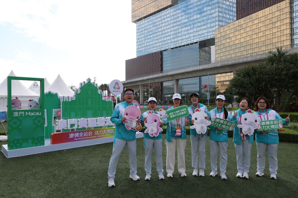 ↑11月15日,澳门赛区志愿者在比赛场地所在的澳门永利皇宫南门户外草坪迎接观众到来。