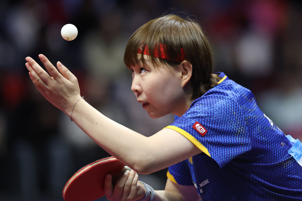 ↑11月16日,澳门队选手朱雨玲在乒乓球女子单打铜牌赛中发球。