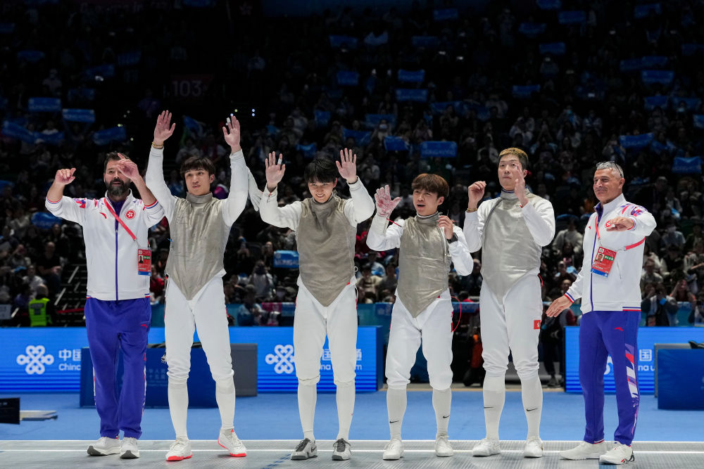 ↑11月19日,香港队选手和教练在男子花剑团体金牌赛夺冠后向观众致意。