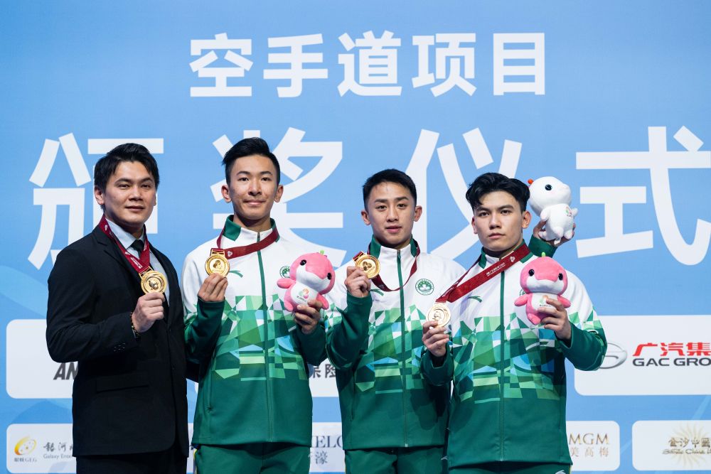 ↑11月6日,冠军澳门队在空手道男子业余组团体型决赛颁奖仪式上。