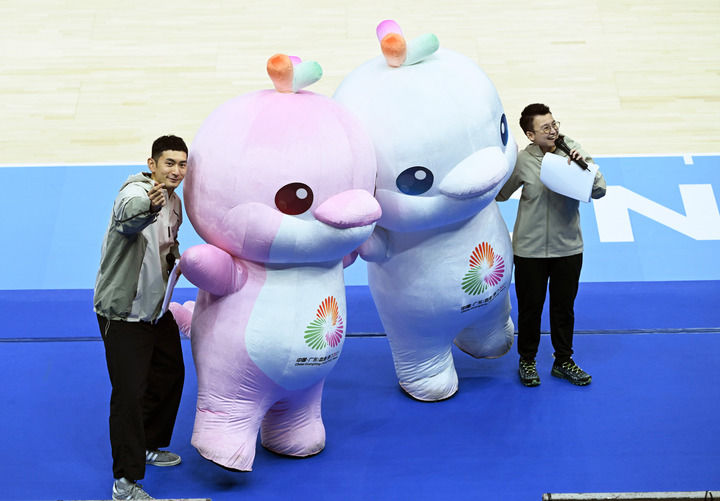 ↑11月11日,在香港举行的第十五届全国运动会篮球男子22岁以下组小组赛中,现场主持人在比赛间隙带着吉祥物与观众互动。