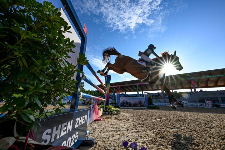 ↑11月17日,香港队选手赖祯敏在马术场地障碍团体赛比赛中。