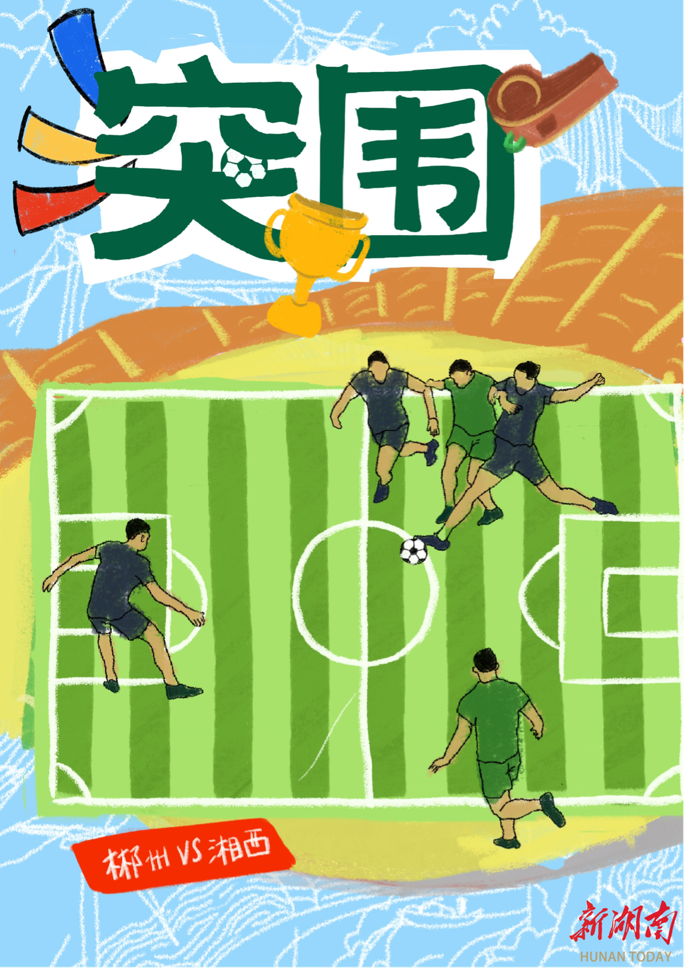 刘诗语将古建筑、水乡船景、丹霞地貌等元素尽显郴州独特风貌巧妙与足球运动活力融合起来。动感十足的足球运动员形象迸发竞技激情,整体设计在展现城市底蕴的同时,强力传递对本地足球赛事的助威热忱与对城市体育精神腾飞的殷切期盼。
