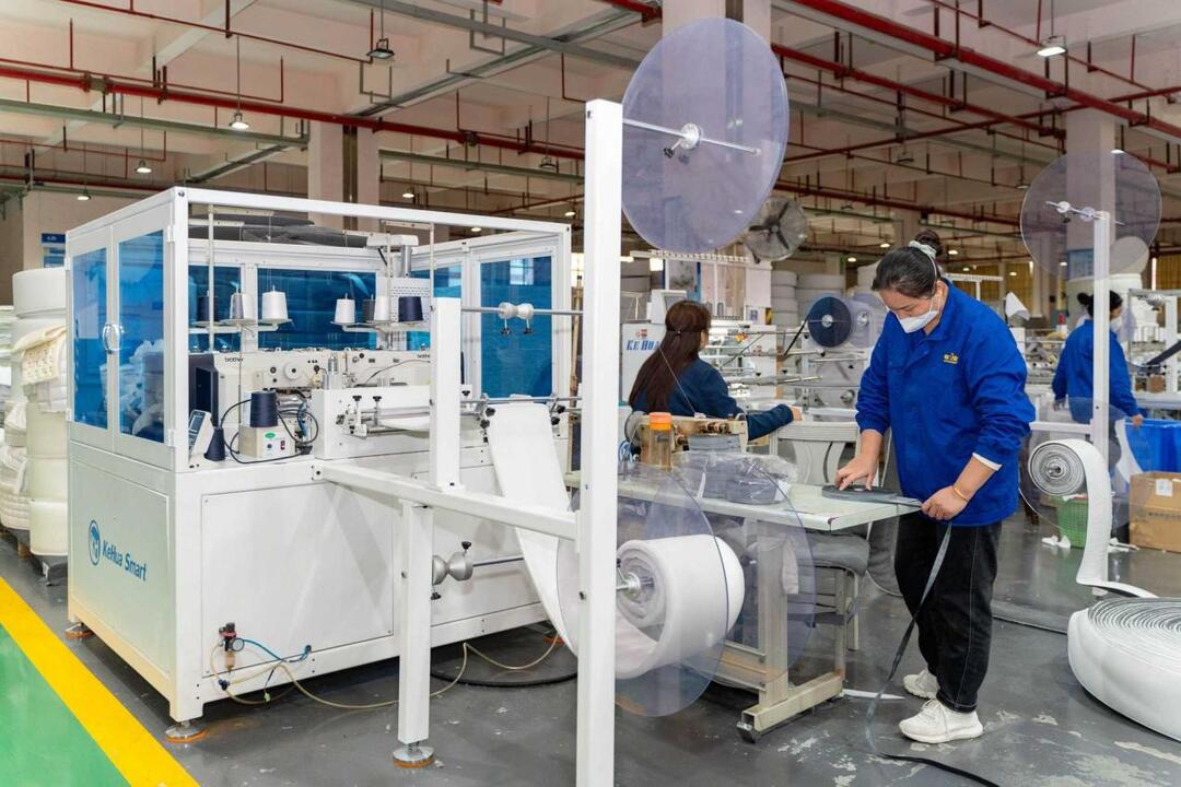 在晚安集团智能化生产车间里,一张床垫正经历着从原料到成品的蜕变。自动化裁床精准切割来自浙江、广东等地供应商的优质面料,机械臂将独立弹簧与环保海绵层层压实,工人们仔细检查每一个细节,从衬垫到绗缝,直至最后包装入库,全程高效而有序。