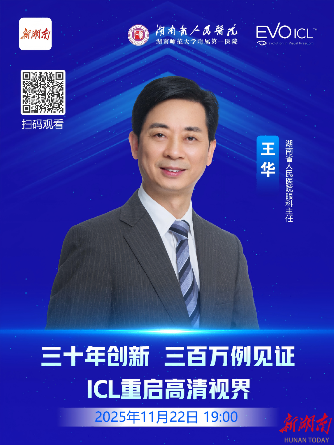 在这样的大背景下,除了常规的框架眼镜与隐形眼镜,安全、有效的近视手术也成为许多成年人寻求清晰视力的重要途径。然而,面对种类繁多的手术方式,公众常心存疑虑:“哪种手术更安全?”“效果能否持久?”“是否会有后遗症?”这些关切,亟需权威、专业的科普来解答。为此,新湖南客户端湘健频道特别策划了一期眼科科普直播,聚焦于目前备受关注的“ICL晶体植入术”。本次直播将围绕“三十年创新,三百万例见证-ICL重启高清视界”这一主题,深入浅出地为大家揭开这项技术的神秘面纱。