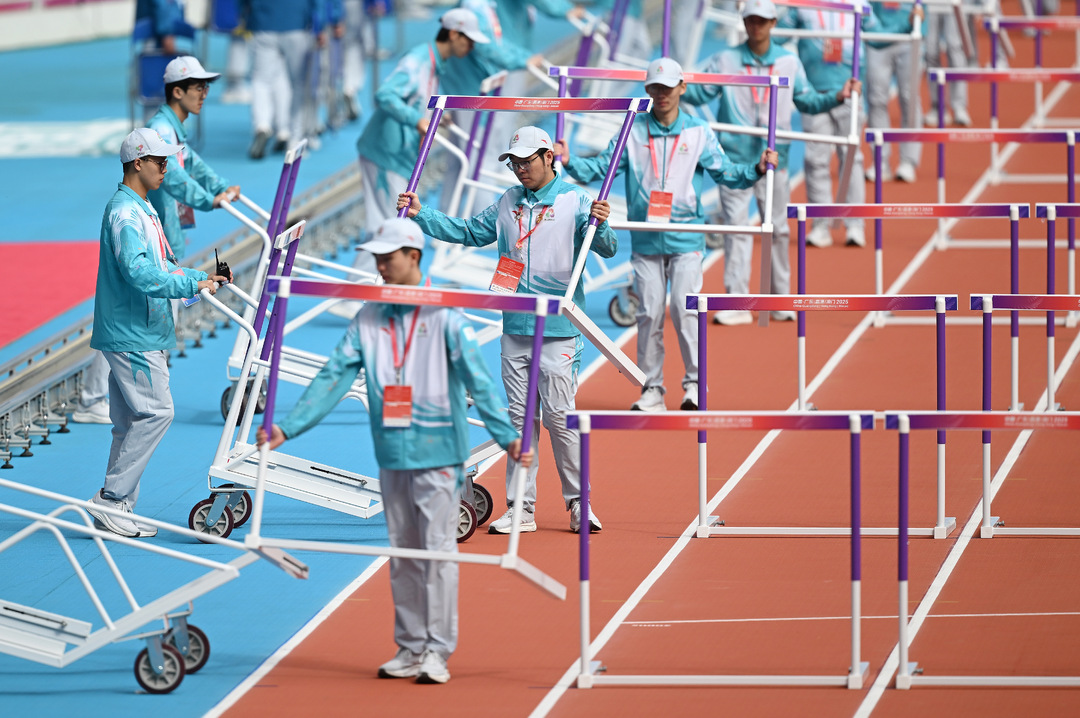 志愿者在赛场上搬运跨栏。新华社记者 邓华 摄