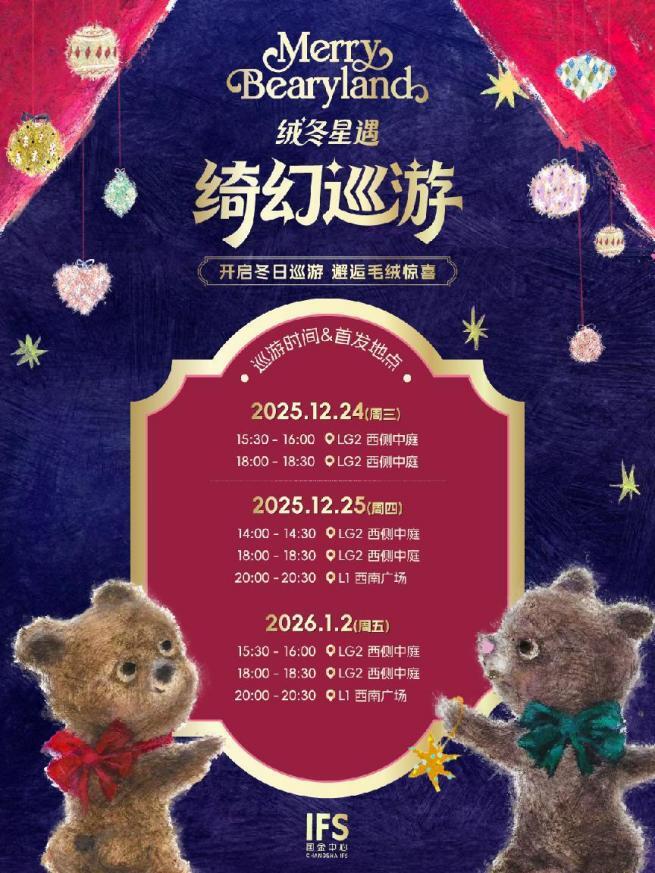 即日起至2026年1月4日,长沙IFS将为大家送上毛绒绒冬日心意,打卡“Merry Bearyland 绒冬星遇”全国首展任意装置,并关注长沙IFS小红书官方账号,拍照带话题#毛绒绒冬日心意 发布小红书平台,即可在LG2西侧中庭装置处获得长沙IFS定制冬日礼遇1份,数量有限,兑完即止。(翟亮)
