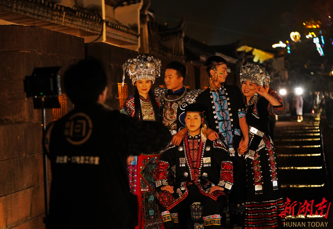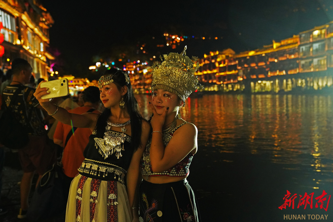 吊脚楼的影子在水里轻轻晃,穿上民族服饰的旅拍队伍一支接一支走过,银饰叮当,像是为这喧闹的夜,敲打着清脆的节拍。女孩们裙摆如花,笑靥盈盈,她们对着镜头,或倚着斑驳的石栏,或临着荡漾的波光,眼波流转里,有羞涩,更有藏不住的、对这片风景的欢喜。那相机一闪一闪的光,便像是夏夜的流萤,为她们定格下属于凤凰的梦。