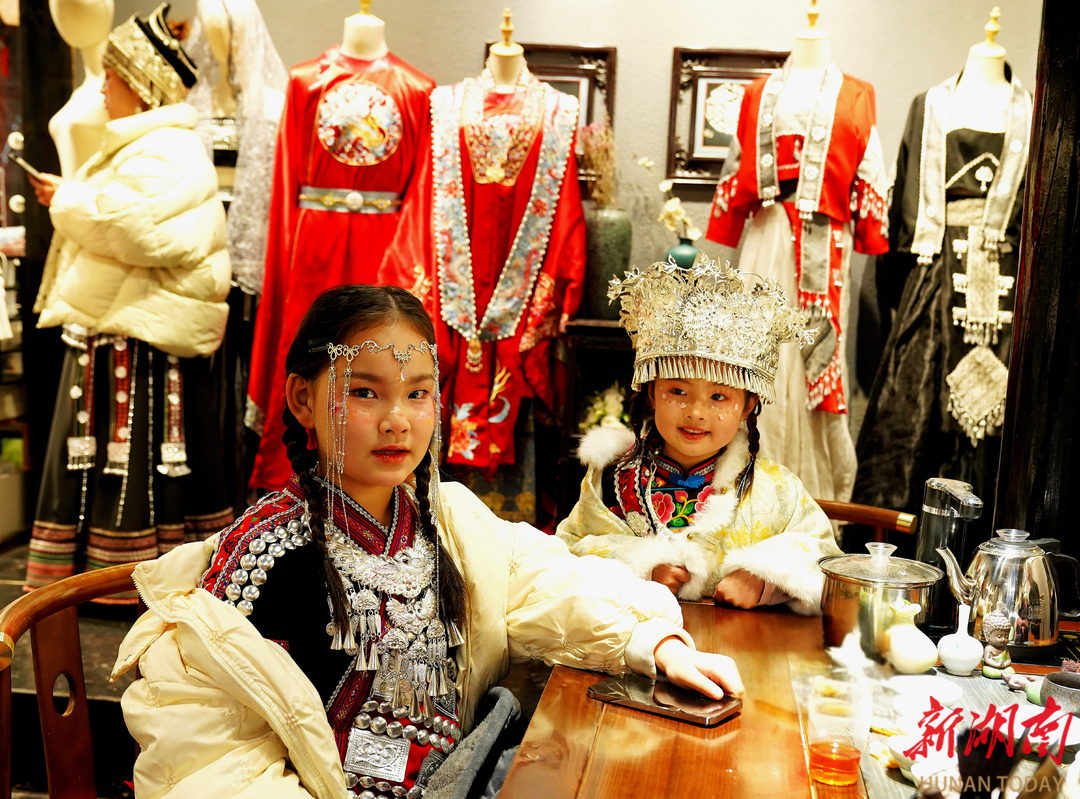 旅拍店里穿着漂亮银饰服装的小姑娘