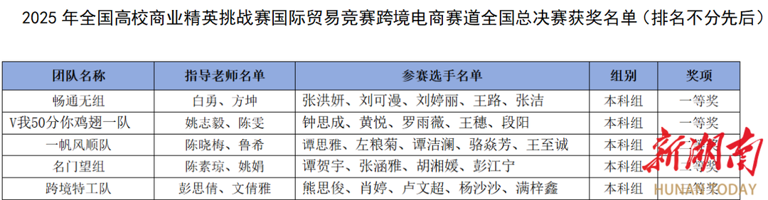 近日,2025年全国高校商业精英挑战赛国际贸易竞赛跨境电商赛道全国总决赛成绩揭晓,湖南财政经济学院首次参赛即取得优异成绩,共荣获全国一等奖2项、二等奖2项、三等奖1项。