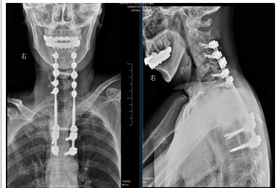 为挽救患者神经功能,抢救患者生命,向伟能迅速组织多学科会诊,为患者量身定制个性化治疗方案:标准四联抗结核治疗、急诊一期颈椎前后路联合病灶清除植骨内固定手术。经过紧急而周密的准备,向伟能团队为艾女士实施了颈椎后路病灶清除椎管减压融合内固定术和颈椎前路病灶清除植骨融合术(图3)。历时6小时,手术团队成功将“蛀骨”病灶一网打尽,并用自体骨填补骨缺损,筑牢脊柱“支撑系统”。得益于成熟的MDT围手术期管理模式,该患者在6小时内顺利完成涵盖9个椎体的融合手术,以及后路联合前路的颈椎病灶清除术,术后患者情况稳定,直接被送返至普通病房,无需转入ICU监护。
