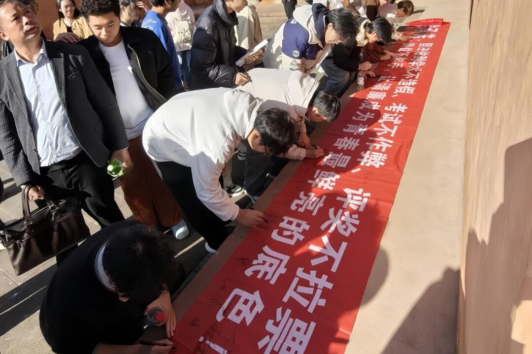 “清廉”不仅镌刻在历史深处,更激荡在青春脉搏里。在故居广场,全体师生纷纷在“廉洁承诺”横幅上签名,二支部党员刘昱岐带领同学们发出倡议:“坚决做到学术不造假、考试不作弊、评奖不拉票、岗位不伸手,让清廉成为青春最鲜亮的底色!”