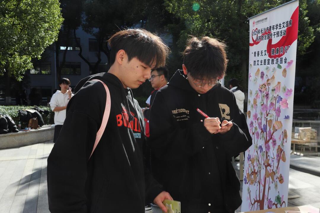 在“知识启航站”,同学们在印有“社会共治、守正创新、终结艾滋”主题口号的横幅上郑重签名,领取宣传手册,开启了防艾知识学习之旅。“防艾知识挑战区”则通过扫码答题,考验大家对传播途径、预防措施等核心知识的掌握程度。