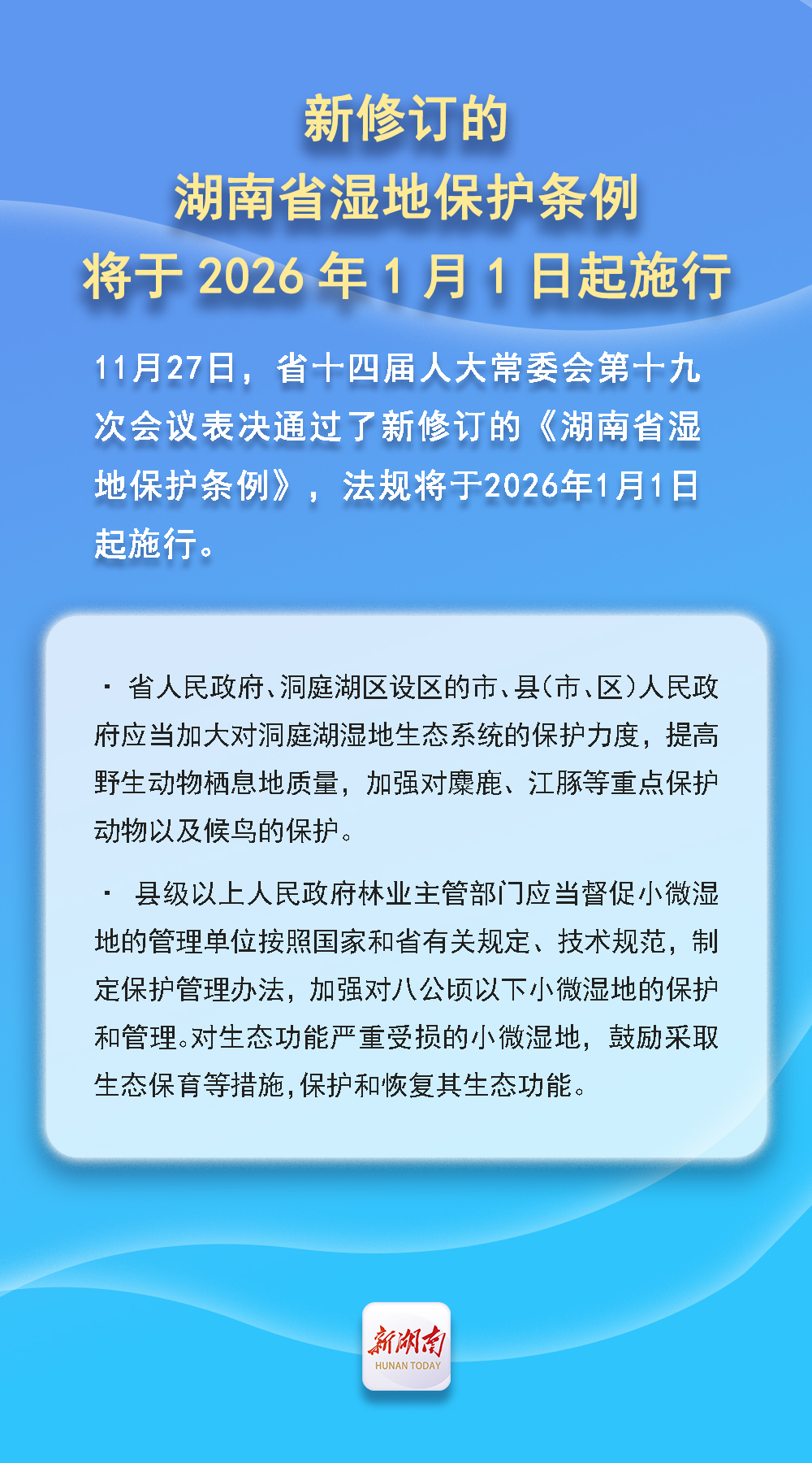 湖南日报·新湖南客户端11月27日讯(记者 郭宸)11月27日,省十四届人大常委会第十九次会议表决通过了新修订的《湖南省湿地保护条例》,法规将于2026年1月1日起施行。