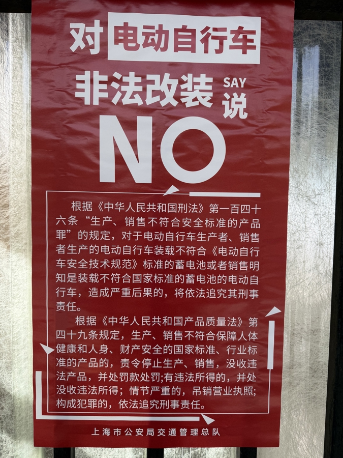 而在各上牌点,很多车主都急着赶“末班车”。昨天下午,在东明路上的浦东公安分局交警支队电动自行车上牌便民点,来办手续的电动车主络绎不绝。新民晚报记者看到,大门口处张贴着“对电动自行车非法改装说NO”的告示,每一辆电动车都被拆开车身,仔细检查电瓶是否有改装,违规车辆一律驳回。