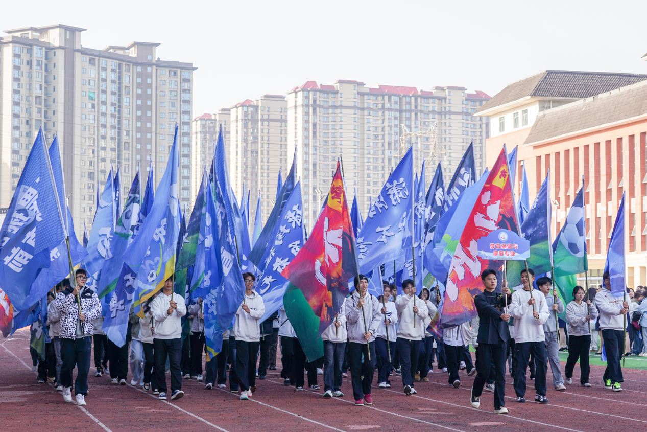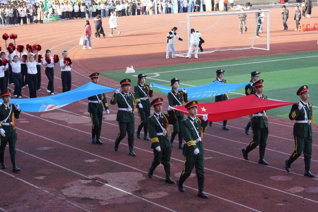 国旗校旗方阵率先入场,他们迈着铿锵有力的步伐,昂首挺胸,目光坚定,以最庄严的姿态守护着五星红旗与校旗,彰显着全校师生锐意进取、奋勇争先的精神风貌。
