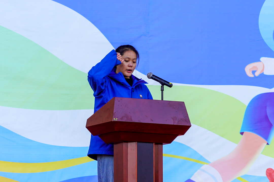 接着,运动员代表,艺术学院舞蹈教育32501班毛宇璇宣誓,将严格遵守比赛规则,尊重对手、尊重裁判,全力以赴、永不言弃,用实际行动诠释体育精神。裁判员代表,唐磊老师宣誓也郑重承诺,将恪守职业道德,公正执裁,保障比赛的顺利进行。