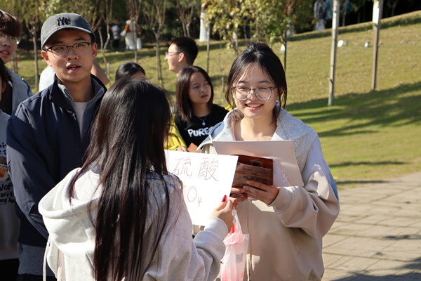 活动以“镇长失踪案”为剧情主线,现场设置了五个任务站点,每个环节都巧妙融合化学知识与趣味互动。在“漆扇工坊”,同学们火眼金睛,从实验操作卡牌中揪出错误,强化规范操作意识;“女巫的糖果”环节犹如元素解谜场,考验着大家对元素特性的理解与团队默契;“DDDD谐音挑战”用轻松幽默的方式帮助记忆复杂术语;“方程式速填”和“实验仪器你说我猜”则分别锻炼快速计算与表达协作能力。为照顾不同专业背景的同学,活动还设置了难度调节机制,确保每位参与者都能乐在其中、学有所获。