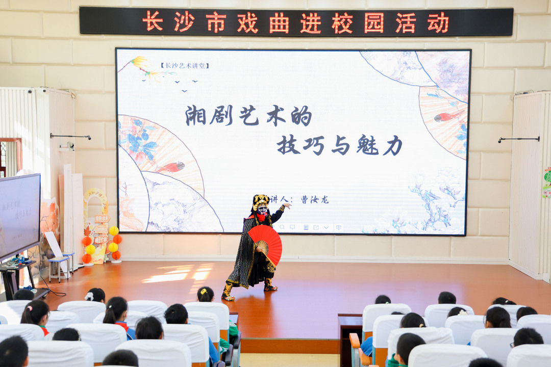 同步开展的“戏剧大师表演课”由专业艺术家指导高年级学生排练湘剧经典剧目《打猎》,从唱腔、身段到舞台呈现进行系统训练;湘剧“大师课”则特邀国家级传承人曹汝龙,为五年级学生讲授湘剧百年文脉,解析经典剧目,生动展现湖湘戏曲的独特魅力。