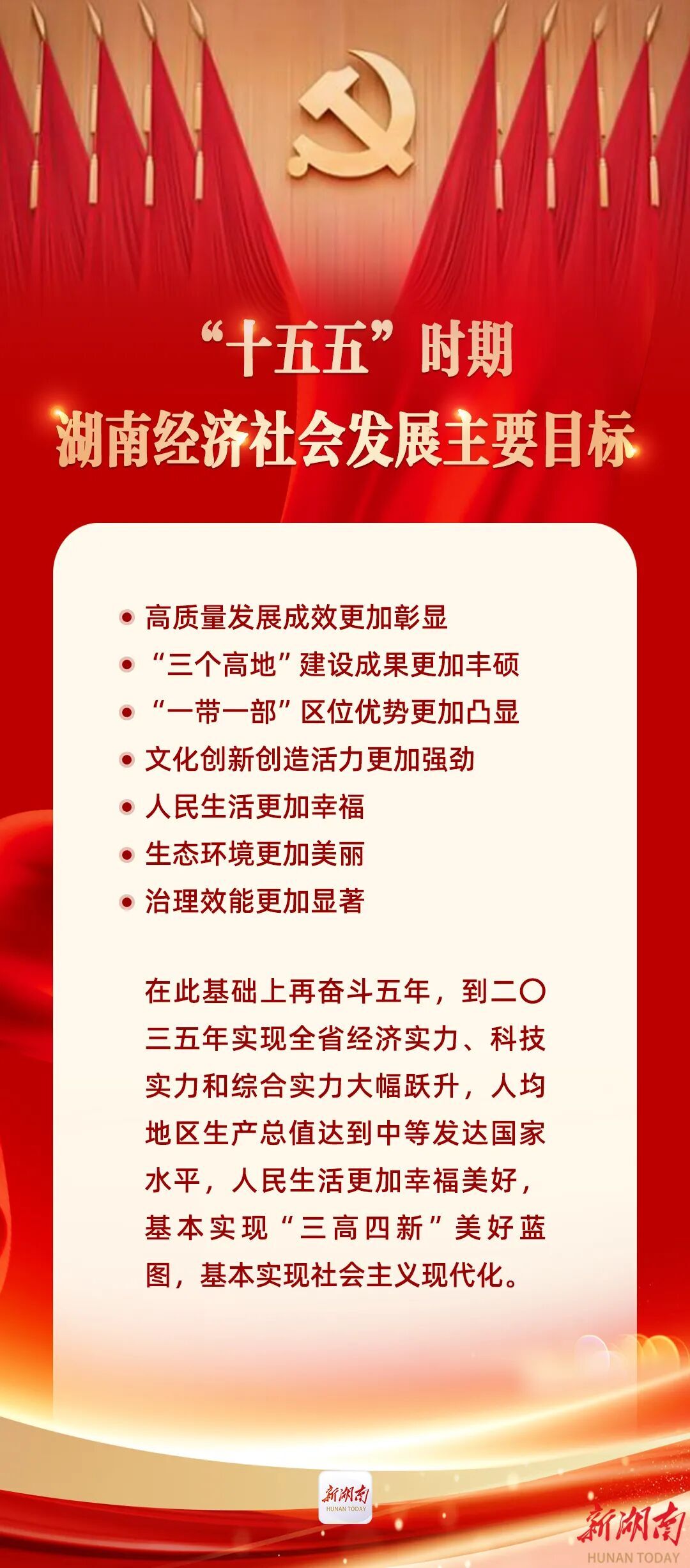 全会提出了“十五五”时期湖南经济社会发展的主要目标:高质量发展成效更加彰显,“三个高地”建设成果更加丰硕,“一带一部”区位优势更加凸显,文化创新创造活力更加强劲,人民生活更加幸福,生态环境更加美丽,治理效能更加显著。在此基础上再奋斗五年,到二〇三五年实现全省经济实力、科技实力和综合实力大幅跃升,人均地区生产总值达到中等发达国家水平,人民生活更加幸福美好,基本实现“三高四新”美好蓝图,基本实现社会主义现代化。