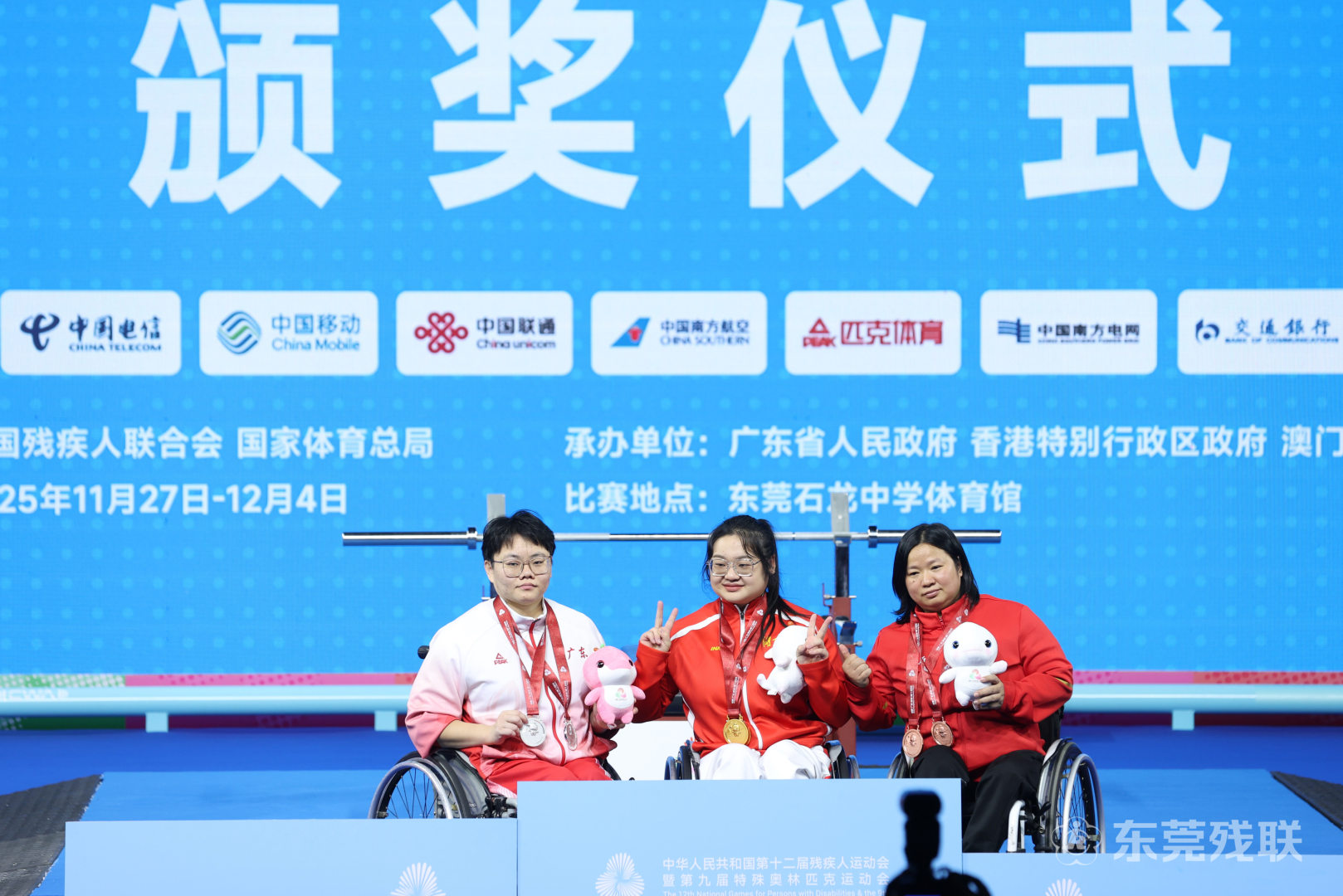 在“残特奥会”举重项目女子61公斤级决赛中,来自湖南岳阳的陈斯佳(中)夺得最佳成绩和总成绩金牌。(通讯员供图)