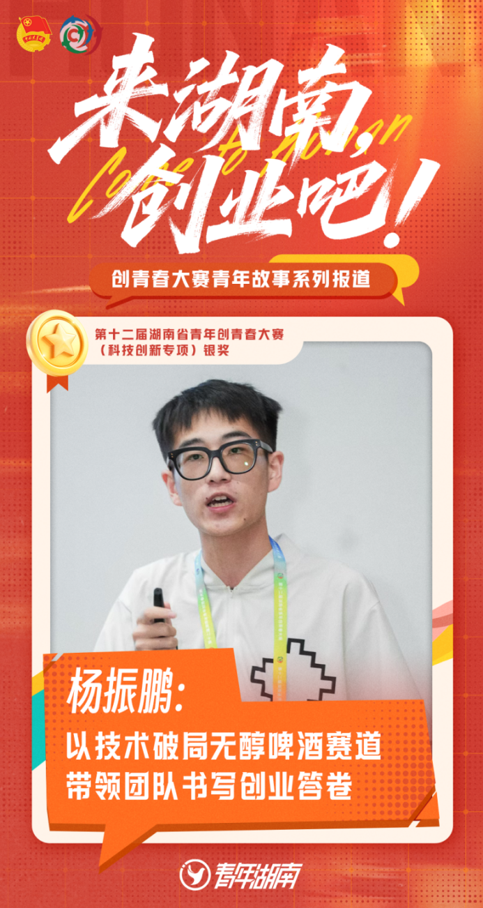 不久前,一个创业项目《“零醇π动力”基于传质——反应耦合的无醇啤酒乙醇脱除与风味物质保留技术研究》成功获得第十二届湖南省青年创青春大赛(科技创新专项)银奖,让无醇啤酒这样的创新型产品再次进入到大众视野。这背后,是00后创业者杨振鹏,以及他带领的“零醇π动力”团队多年的深耕与突破。