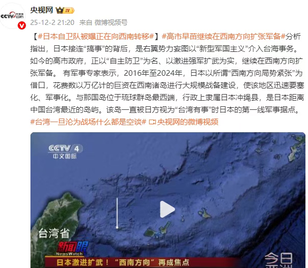 据央视网报道,分析指出,日本接连“搞事”的背后,是右翼势力妄图以“新型军国主义”介入台海事务。如今的高市政府,正以“自主防卫”为名、以激进强军扩武为实,继续在西南方向扩张军备。有军事专家表示,2016年至2024年,日本以所谓“西南方向局势紧张”为借口,花费数以万亿计的巨资在西南诸岛进行大规模战备建设,使该地区迅速要塞化、军事化。与那国岛位于琉球群岛最西端,行政上隶属日本冲绳县,是日本距离中国台湾最近的岛屿。该岛一直被日方视为“台湾有事”时日本的第一线军事据点。