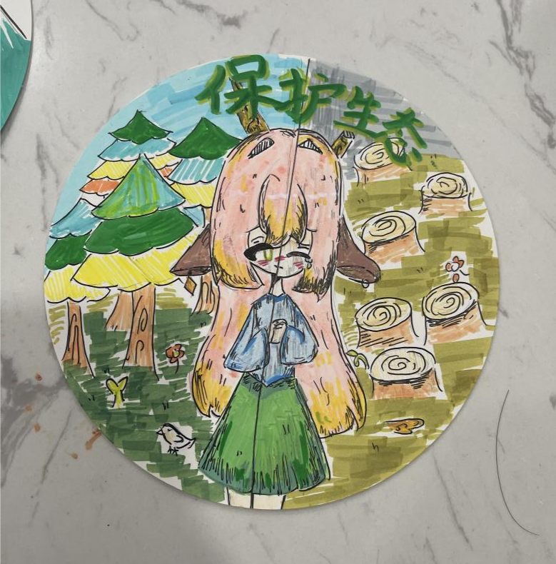徽章设计聚焦森林资源保护,以“森林拟人化”形象(垂泪的长发女孩)对应右侧的树桩,将森林的“伤痛”具象化——长发似枝叶、神情哀伤,直观传递乱砍滥伐对生态的伤害。左侧的青绿树木、小鸟、花朵代表“原本的生态生机”,与右侧的树桩形成强烈对比,突出“破坏”与“失去”的冲击感。结合“保护生态”的文字,用拟人化的情感共鸣,呼吁人们关注森林砍伐问题,从“看见伤痛”到“主动守护”,让生态保护从理念落地为共情。