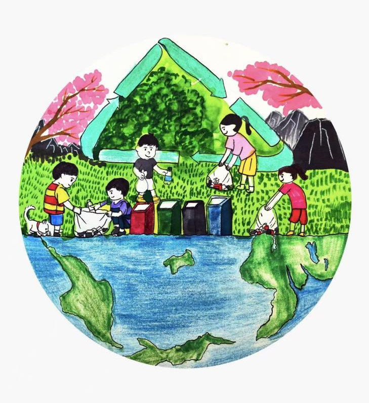 徽章设计主题为“保护地球,从我做起”,画面呈现出人们在地球之上积极开展垃圾分类的场景,周围有绿树、粉花等美好环境元素,还有代表循环利用的绿色箭头标志。它传达出这样的理念:保护地球需要每个人的参与,从日常的垃圾分类等小事做起,就能为守护地球的生态环境、让地球保持美丽宜居的状态贡献力量,呼吁大家践行环保行动,共同呵护我们的家园。