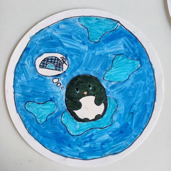 徽章设计聚焦全球气候变暖导致极地冰川融化,画面里地球以蓝色为主色调,代表海洋,上面有几块陆地。一只企鹅身处其中,眼中含泪,旁边的气泡里是它思念的冰雪家园,设计旨在反映,企鹅等极地生物的生存家园受到严重威胁的现状,以此呼吁人们重视环境保护,减少温室气体排放,守护极地生物的生存家园,保护地球的生态平衡。