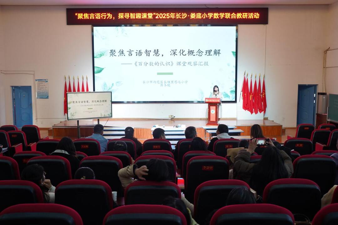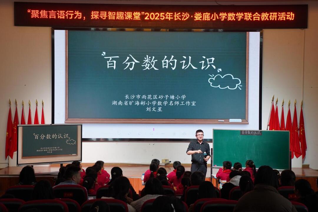 课例展示环节精彩纷呈。来自长沙市砂子塘新世界小学的谢珏老师执教三年级《分数的初步认识》,她紧扣学生认知起点,自然渗透分数本质;强化直观操作,分层建构概念意义;巧妙融入游戏互动,深化分数大小的认识。长沙雨花区砂子塘小学刘文星老师则带来六年级《百分数的认识》,他以“篮球比赛”真实情境贯穿全课,引导学生在数据分析中体会百分数的统计意义与应用价值,通过层层递进式问题激发孩子们的逻辑思维与创新意识。两节课均重视语言引导与思维启发,生动诠释“智趣课堂”构建理念,展现了教学创新的实践成果。